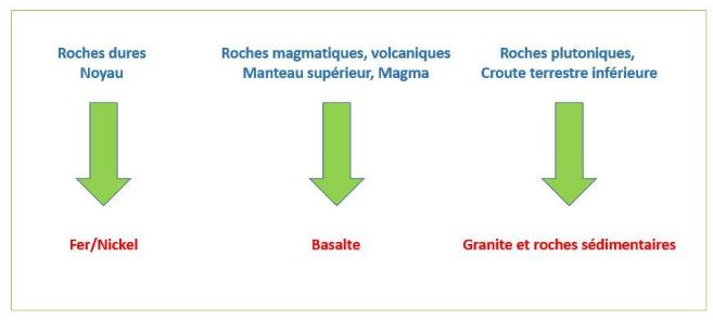 Juste sous la croûte terrestre on trouve les roches plutoniques qui sont différentes des roches volcaniques. Parmi celles-ci on trouve le granite. Le granite c’est 70% de silice, 14, 5% d’alumine, 8,6% d’alcalin (le KNaO), 3% de fer, 2,6% de calcium et 1% de magnésium.